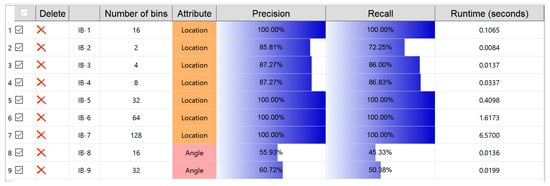 The different attributes taken for KDE modeling and then for IB-based clustering essentially play an important role for observing the trajectory data from diverse perspectives. As a matter of fact, to select which kind of attribute for trajectory data should be closely relevant to their application backgrounds. For example, the angle attribute is used for trajectory shape analysis []. As for the CROSS dataset used here, we believe that location is the most critical attribute, because all the trajectories of this dataset happen at a cross road intersection and behave according to the required traffic rules based on location. This is verified by the better performance evaluations resulted from the use of location compared with those from the use of angle: an example organization by Ranking View lists trials of IB clustering with different precision and recall values due to different attributes used (Figure 8).