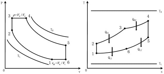 Figure 1 shows P-v and T-s diagrams of an endoreversible DMC (1-2-3-4-5-6), which includes constant temperature heat source and constant temperature heat sink. Processes and are adiabatic compression and adiabatic expansion processes; and are constant volume processes; and and are constant pressure processes.