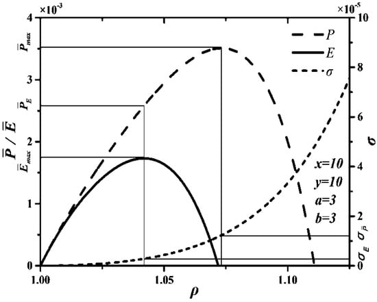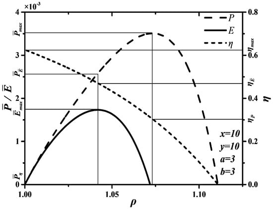 Figure 2, Figure 3 and Figure 4 show the non-dimensional power output () versus cut-off ratio (), versus thermal efficiency (), and non-dimensional ecological function () versus characteristics when and take different values, respectively. In Figure 2 and Figure 4, one can see that and first increase and then start to decrease with increasing . There are two different when and reach to zeroes, respectively. Moreover, there are different optimal cut-off ratios () to make and reach their maximum values, respectively. However, there are some differences between the curves of versus and versus . For example, the ending point of is 1.111 corresponding to , but the ending point of is 1.071 corresponding to . The reason is should be larger than zero if according to the definition of , which shrinks the range of .
