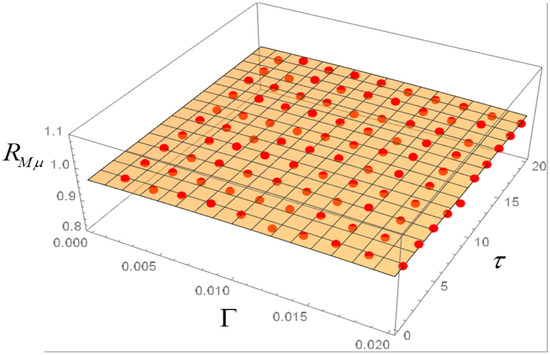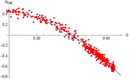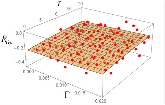 Note that for values of G much smaller than usual, even the correlation can become positive: see Figure 1, obtained with the mixed noise introduced in [21] and extending to the (unrealistic) value of . In order to obtain a meaningful diagram, one needs to generate a large number of distinct initial conditions for the stochastic equations, each one having a different value of . For instance, in Figure 1 there are 480 initial conditions, one for each result represented by a red dot. Every result is the average of 80 realizations starting from those initial conditions.