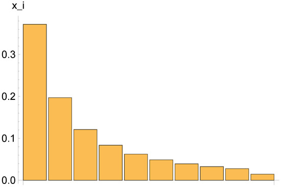 Histogram of a typical deterministic equilibrium configuration, with 10 income classes (see details in the text). The bars represent the populations .