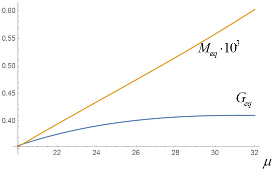 Behavior of the Gini index G and the social mobility M as functions of the total income for the deterministic model, at equilibrium. The asymptotic equilibrium of the deterministic equations does not depend on the detailed initial conditions (class populations), but only on the total income ( is conserved in the deterministic evolution). This plot is obtained by taking several values of as explained in Section 2.1, letting the system evolve deterministically and computing G and M in the equilibrium state. The relation between G and allows to determine a range of values of which corresponds to a range of realistic values of G.