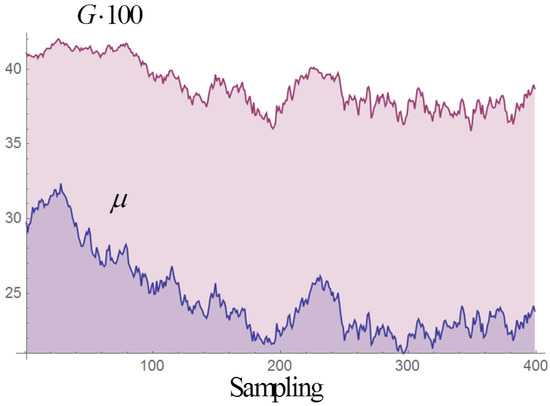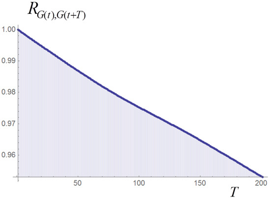 In the discretized Langevin Equation (1) we typically set or and let the system evolve in time-series of 5000 steps, repeated for realizations; varies between 50 and 6000, depending on the scope. (The choices for and the number of steps are based on our previous experience with the relaxation time of the deterministic system.) In the following we shall also compare results obtained through time-series of 10,000 integration steps and realizations, or time-series of 2500 steps and realizations; in principle the results should coincide in the ergodic limit and in fact the averages are very close, but we have found that correlation estimators obtained with the time-series of 5000 or 2500 steps tend to display smaller fluctuations. After each integration step the values of G and M are computed. Both quantities are non-trivial functions of the populations . They fluctuate around their equilibrium value according to a Wiener process (see example in Figure 4), as can be checked by evaluating the Hurst exponent of their time-series, which is very close to 0.5. The time auto-correlation function of G is remarkably linear (Figure 5). The same is true for the auto-correlation of and M, though not reported here. (We recall the definition of the Hurst exponent in this context: in a time-series with N points, the expectation value of the ratio between the range of the series and its standard deviation is proportional to as , where H is the Hurst exponent).
