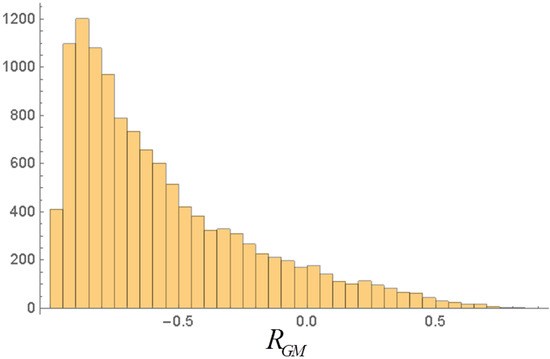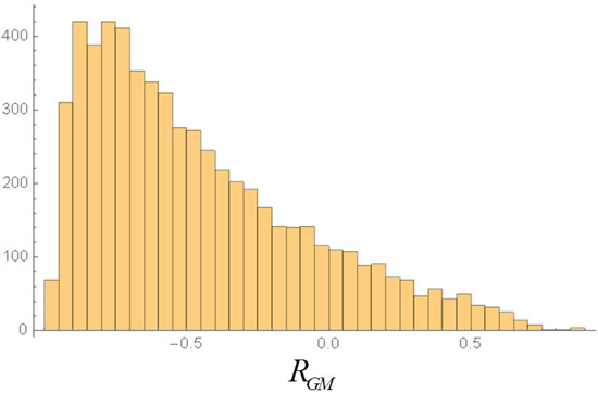 At the end of each time-series we compute the equal time correlation estimators (Pearson coefficients) between G and M, G and , M and . The sign and amplitude of the correlations vary quite strongly in the single realizations. For instance, by performing a very large number of realizations (6000 or 12,000) we find for the results of the G-M correlation in each realization the histograms in Figure 6 and Figure 7.