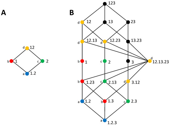 Redundancy lattices of [33]. The lattices reflect the partial ordering defined by Equation (8). (A) Bivariate lattice corresponding to the decomposition of . (B) Trivariate lattice corresponding to the decomposition of . The color and label of the nodes indicate the mapping of partial information decomposition (PID) terms from the trivariate to the bivariate lattice; in particular, nodes with the same color in the trivariate lattice are accumulated in the corresponding node in the bivariate lattice.