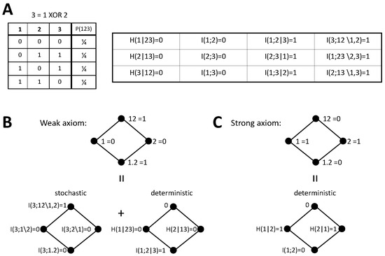 Given the equality , by the independent identity property because all three variables of the XOR system are independent. Furthermore, the terms were determined by the monotonicity axiom [41] as , or by the identity axiom [44] as . This means that the minimal extra assumptions, apart from the original axioms, are the independent identity property, as pointed out by [41], and the invariance under the reduction of 123 to 12.
