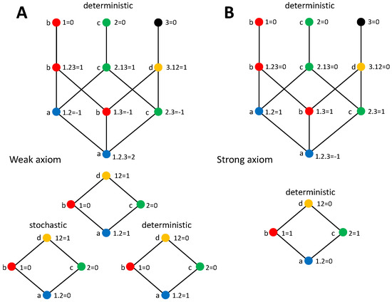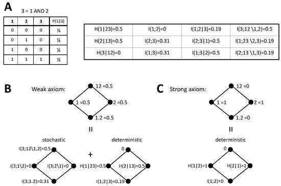 Accordingly, from the nodes reachable descending from , all redundancies are determined except and itself. Because the objective of the proof was only to show that a negative term has to exist, and not to actually calculate each PID term, [41,42,44] considered that vanishes, which preserves the monotonicity of . Given that, they determined a bound . In fact, one may argue that can be negative, which still preserves the monotonicity of , and already would lead to the existence of a negative term. In particular, can be negative if it is compensated by the terms being positive and of equal magnitude, so that . This is actually what we find in Figure 4B with the strong axiom, and this decomposition is completely compatible with the values and determined in these proofs using the axioms as described above. Taking this into account, we see that these proofs work as proofs of existence of at least one negative term, but this negative term can either be or .