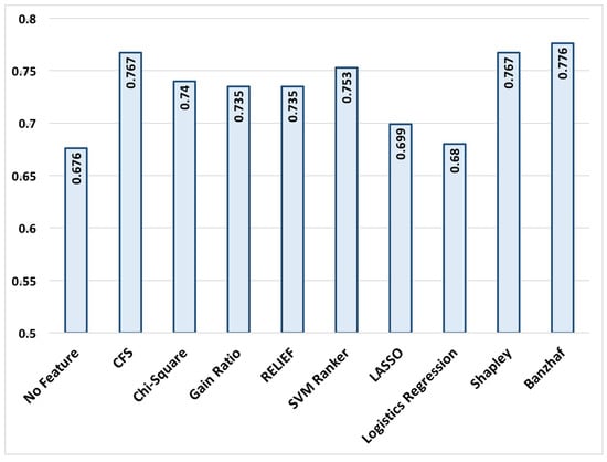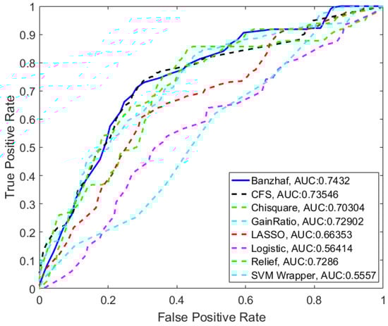 Figure 4 compares the ROC (receiver operating characteristic) curve for different feature selection methods using Bayes-Net classification with 10-fold cross validation. As can be seen in Table 3, the proposed method that is based on calculating Banzhaf power achieves the highest area under the ROC curve (AUC = 0.7432) compared to well-known feature selection techniques.