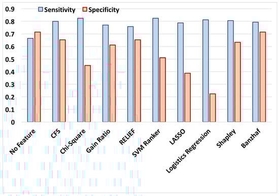 Sensitivity and specificity of various feature selection methods using top-20 features and Bayes-Net classification with 10-fold cross validation.