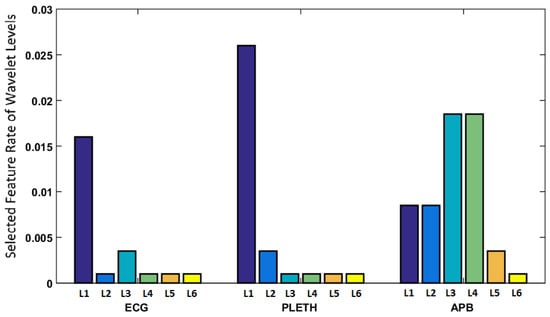 Relative appearance of selected features in different levels of wavelets for the vital signals.