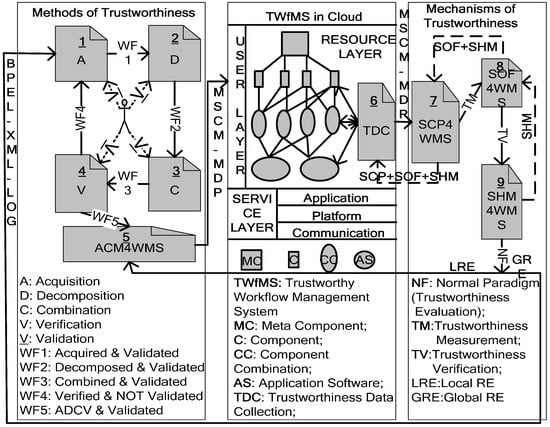 Based on the above model, from the implementation view of software architecture, we propose the core components of the methods and mechanisms [,] as illustrated in Figure 2. Compared with the method of trustworthiness and the TWfMS in the cloud in Figure 2, here we place emphasis on the mechanisms of trustworthiness, comprising SCP4WMS, SOF4WMS, and SHM4WMS: