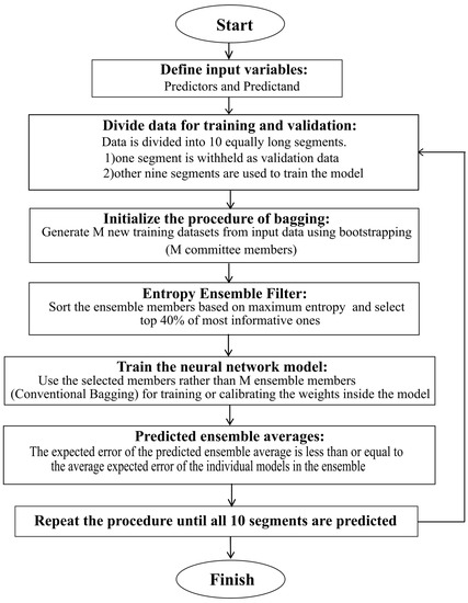 Most data-mining algorithms require proper training procedures [1,2,3,4,5,6,7,8,9,10,11,12,13,14] to learn from data. The Bootstrap AGGregatING (bagging) method is a commonly used tool in the machine learning methods to increase predictive accuracy. Despite its common application, the bagging method is considered to be computationally expensive, particularly when used to create new training data sets out of large volumes of observations [15,16,17]. To improve the computational efficiency, Wan et al. [15] proposed a hybrid artificial neural network (HANN), while Kasiviswanathan et al. [17] combined the bagging method with the first order uncertainty analysis (FOUA). The combined method reduced the computational time of simulation for uncertainty analysis with limited statistical parameters such as mean and variance of the neural network weight vectors and biases. Wang et al. [16] showed that sub-bagging (SUBsample AGGregatING) gives similar accuracy but is computationally more efficient than bagging. This advantage is highlighted for Gaussian process regression (GPR) since its computational time increases in cubic order with the increase of data. Yu and Chen [18] compared different machine learning techniques and found that the fully Bayesian regularized artificial neural network (BANN) methods are much more time consuming than support vector machine (SVM) and maximum likelihood estimation (MLE)-based Gaussian process (GP) model. Table 1 provides a brief overview of studies that applied the bagging method in a range of different machine learning algorithms.