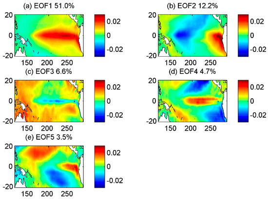 Spatial patterns (eigenvectors) of the first five PCA modes for the SST anomaly field. The percentage variance explained by each mode is given in the panel titles.