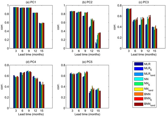 We first inter-compare the performance of the nine modelling schemes across all five SST PCs and all five lead times by looking at the correlation between modelled and observed predictands (Figure 3). Note that, relative to Wu et al. [20] all our correlations are higher. It is important to note, though, that different time periods were used for the forecast, due to data availability. The pattern across PCs is the following: for the first PC, which carries most of the variance and spatially best resembles the ENSO pattern, all models perform equally well at all lead times with correlation coefficient greater than 0.9 for the lead times of 3–9 months. As we move to higher PCs in our experiments, with the exception of PC4, the neural network models out-perform the MLR model, especially at the lead times 12 and 15 months. The better performance of neural network models is particularly striking for the PC2 with lead times 12 and 15 months where the correlation of MLR model substantially drops from the value greater than 0.8 at the 3-month lead time to the value less than 0.2 at the 15-month lead time. This result indicates the importance of using nonlinear models for higher lead times, corroborating the findings in Wu et al. [20]. The BNN and NN models perform similarly well for PC1, PC2 and PC4, while the BNN model scores higher for PC3 and lower for PC5. The variation in skill between different methods seems to increase with increasing lead time and with higher PC modes. In general, the expected decrease of skill at higher lead times is visible throughout all PCs, except for PC4 where the predictability peaks at 9-months lead time.