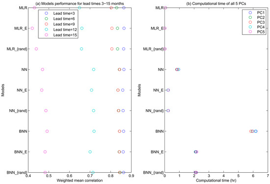 To assess the overall model performance, i.e., combining the skill across all five PCs, we derive the weighted mean correlation across all the PCs, for each lead time, assigning the weights to each PC mode according to the amount of variance explained by the mode (Figure 4a). The following patterns emerge: (1) all models perform equally well for the lead time 3 and 6 months; (2) MLR model’s skill drops at 9 months lead time more substantially than the skill of other models; (3) at the lead times of 9 and 15 months, the NN models outperform MLR models by roughly 0.05 difference in mean correlation (the difference between these models’ correlations is statistically significant, Steiger’s Z = 4.174 [50], p < 0.01 and Steiger’s Z = 1.73, p < 0.05 at the lead times of 9 and 15 months respectively); (4) the NN models all produce correlations very close to each other (within 0.01 difference in correlation); (5) at the 15-month lead time the BNN model is the best performing model; and (6) overall, EEF method achieved a significant reduction in computational time and performed well especially in the forecast at the first 3 lead times. However, its underperformance at 12 and 15 lead time can be regarded as a compromise on computational time-saving.