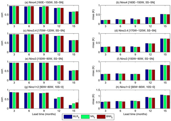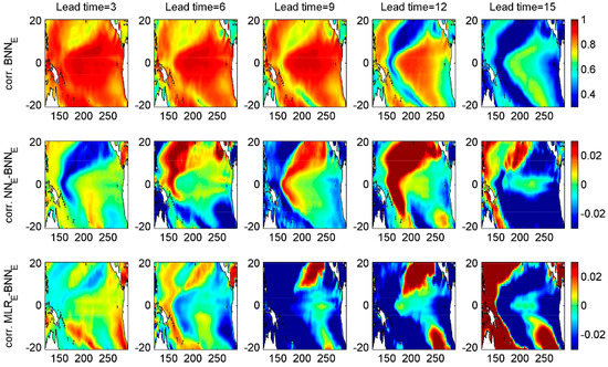 To estimate the regional forecast skills over the whole tropical Pacific, SST anomaly fields were reconstructed from five predicted PCs multiplied by their corresponding EOF spatial patterns. We spatially averaged the reconstructed SST anomalies over the Niño 4 (160° E–150° W, 5° S–5° N), Niño 3.4 (170° W–120° W, 5° S–5° N), Niño 3 (150° W–90° W, 5° S–5° N), and Niño 1+2 (90° W–80° W, 10° S–0°) regions, and then computed the correlation skills and root mean squared error (Figure 5). We focus on the difference among the model performance with the EEF method (MLRE, NNE, and BNNE). Overall, their performances are at the same level at lead times of 3–12 months. The BNN model provides a better correlation skill than the other two models at 15 months lead time for all regions and especially for Niño 1+2 domain. We also look into the correlation skills spatially across each domain, i.e., correlation between reconstructed modeled and observed SST anomalies for each grid cell in the domain (Figure 6). At 15 months lead time, the large part of the domain is best simulated with the BNN model. There are significant variations between BNN and NN forecast skill at different lead times in central- northern equatorial region of the tropical Pacific. We also compared the time series of modeled vs observed SST anomalies averaged within the Niño 3 and Niño 1+2 regions at lead times of 3–15 months for the three models with the EEF method (see Appendix A). As expected, all models produced successful forecasts for the major El Niño and La Niña episodes at 3 months lead time. The BNN model outperformed other models at higher lead times, especially in Niño 1+2 region.