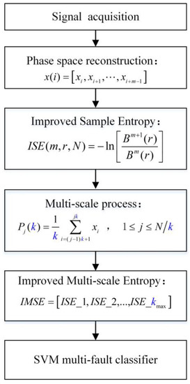 The acquired vibration signals are always overwhelmed by heavy background noise and accompanied by non-stationary and non-linear characteristics [31,32,33]. The key point of bearing fault diagnosis is the manner by which the fault feature information is extracted from the vibration signal with noises. The SVM classifier, which has good learning ability, has been used with IMSE algorithm to identify different vibration signals during different conditions [34,35,36]. The diagnosis flow chart of IMSE is shown in Figure 3. Overall, the bearing fault diagnosis based on IMSE algorithm can be summarized as follows: