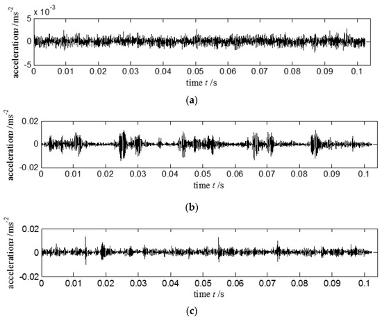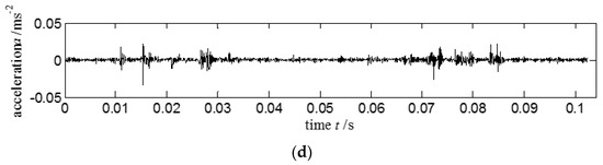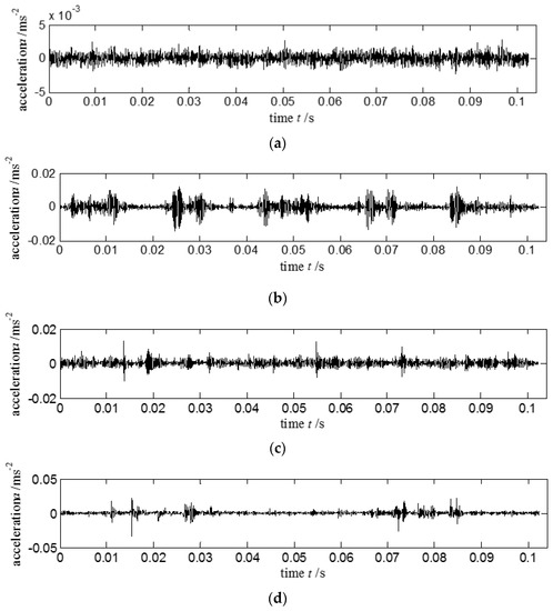 Different bearing statuses for the acquired vibration signals in time domain: (a) normal signal; (b) vibration signal with inner race-way fault; (c) vibration signal with outer race-way fault; and (d) vibration signal with roller fault.
