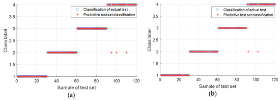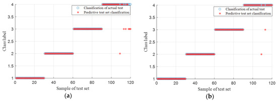 To be more intuitive in describing the superiority of IMSE, four state data are randomly selected, which included training and testing sets. Then, we calculated MSE and IMSE features. Eigenvector is inputted into the SVM system. Fault classification comparison results are shown in Figure 7a,b. These two figures show that the classification result processed by IMSE is slightly better than MSE.