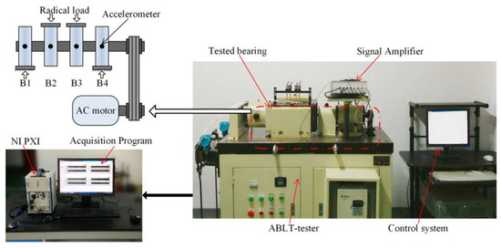 Case II: This experiment combined LabVIEW with other data acquisition devices for acquiring vibration signals. Experimental test platform is shown in Figure 8. Detailed facilities included ABLT test platform, signal enhancement equipment, monitoring system, four tested bearings, and NI PXI acquisition system. Production type of the tested bearing is HRB6305. The tested bearing is embedded into the bearing sleeve. A three-phase electric motor provides the power. The bell is connected to the motor through the pulley. Radial load of the loading system P = 20 kN is loaded into the tested bearing. The rotating rated speed of the electric motor nr = 3000 r/min, the rated current Ie = 6.3 A, and the sampling frequency fs = 20 kHz. Tested bearing with different fault types is presented in Figure 9. Acquired vibration signals in time domain with different status are given in Figure 10. Figure 10a–d show the vibration signals of the bearing with normal, inner race-way fault, outer race-way fault and roller fault, respectively.