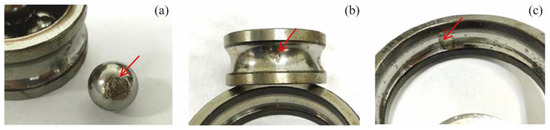 Tested bearing with different fault types: (a) roller fault, (b) inner race-way fault, and (c) outer race-way fault.