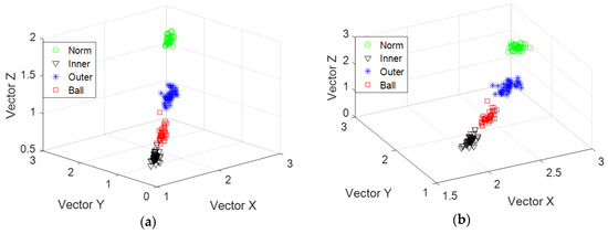 Different status information is calculated using MSE and IMSE methods. For each state, we considered 50 data sets and eigenvalue k = 5. Thus, the data dimension is 200 × 5. We took the first 200 × 3 data matrix as an eigenvector matrix. Classification results are shown in Figure 6a,b. Figure 6a shows an overlap between the roller and inner race-way faults. However, the overlapping phenomenon does not occur under different bearing statuses, as illustrated in Figure 6b. This result implies that different bearing statuses could be easily classified by using the IMSE feature.