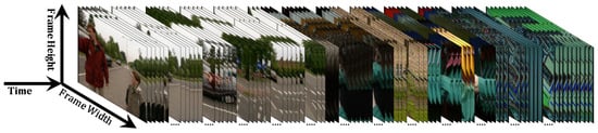 Text, audio, and image constitute the contents of a video data stream. Videos contain richer information compared with images, and their organization is not well defined []. This scenario highlights the need for video content analysis [,]. A video is a signal composed of a sequence of frames with a specific frame rate ( measured in frames per second or fps) accompanied by an audio track. A video is defined as a 3D signal in which the horizontal axis is the frame width () and the vertical axis is the frame height () representing the visual content. The third axis represents the variation in frame content along with time (T for total time or for number of frames ) [,], as shown in Figure 1. Hence, a point in a video is identified by its 2D positions (x and y pixel positions) and the time or frame index at which it occurs. A video can be described as