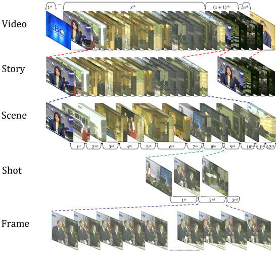 To some extent, video hierarchy is comparable to a book. A video consists of a single story (such as a football game) or multiple stories (such as news) []. A story is defined as a clip that captures a series of events or a continuous action, and it may be composed of several scenes. A scene is a pool of semantically related and temporally contiguous shots captured at multiple camera angles [,]. Figure 2 shows the hierarchy of a video. As previously mentioned, the hierarchy of a video closely resembles that of a document, such as a book consisting of chapters, which are similar to stories in a video []. Each chapter comprises sections similar to scenes. Sections consist of paragraphs similar to a video comprising shots. A paragraph is a group of interconnected sentences that are similar to the interconnected frames that constitute a shot in a video. Moreover, a sentence is composed of multiple words, similar to a shot being composed of frames. Each frame in a video represents a single image, while a shot represents a continuous sequence of frames captured by a single camera, as explained previously.