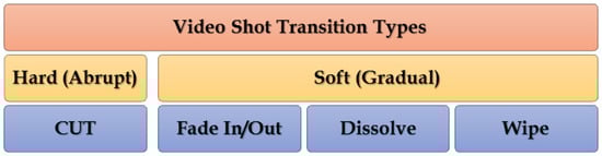 The frontier between two shots is known as the boundary or transition. Concatenation between two or more shots is implemented in the video editing process (VEP) to create a video during the video production process (VPP) []. The digital video editing process allows for the creation of incalculable types of transition effects. Directors or individuals use VEP for stylistic effects. Generally, the frontiers between shots are of two types, namely, hard and soft transitions.