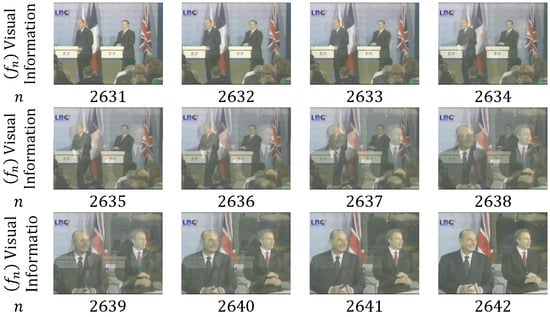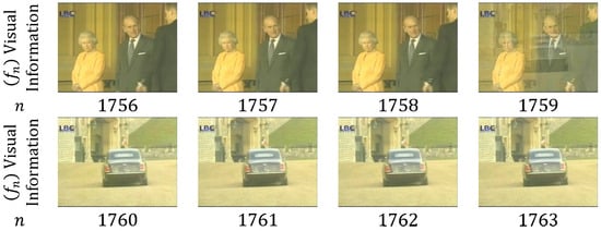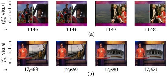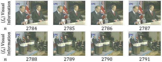 HT is also known as a cut, a sharp transition, a sudden transition, and an abrupt change. HT refers to a sudden change in temporal visual information, in which two consecutive shots are attached without any VEP [,]. Figure 5 presents an example of HT, in which (no frames exist between two shots), which occurs between the last frame of the previous shot and the first frame of the next shot (between frames 2787 and 2788).