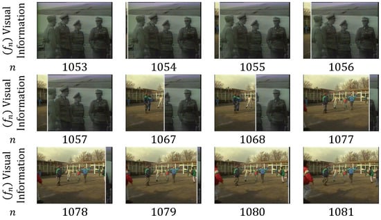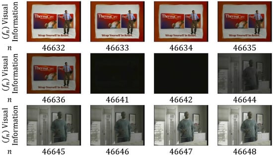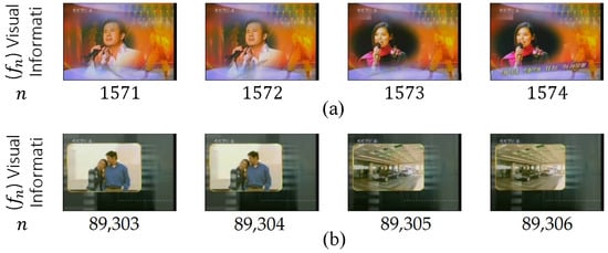 By contrast, ST occurs when two shots are combined by utilizing special effects throughout the production course. ST may span two or more frames that are visually interdependent and contain truncated information [,,]. Commonly, ST comprises several types of transitions, such as dissolve, wipe, and fade in/out [] (see Figure 3).