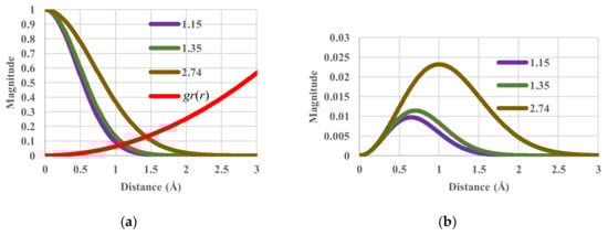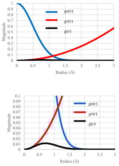 We first plot the ge(r), gr(r) and g(r) distributions in the standard case (T = 161.73 K) in Figure 1 where the profile of g(r) represents the superposition of ge(r) and gr(r). The configurational energy and entropy were also calculated with Equations (13) and (15). Their values are 0.00790 K and 0.66779 kB, respectively.