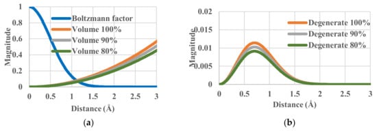 To check the effects of effective volumes, we have calculated with Equation (17) the partition function through a spherical integration. By multiplying the gr(r) or gr’(e) terms and some constant value, we can artificially increase or decrease the effective volume in which the particles move under the same temperature conditions. This operation simulates some sort of blocking or pinning of particles. The effective volume was decreased from 100% (the standard case) to 90% and 80%. The components of single-particle partition function are shown in Figure 3. Although the Boltzmann factor ge(r) is invariant, the effective volume does vary. The corresponding values of entropy are 0.66779, 0.56243 and 0.44465 kB. All the corresponding configurational energies are 0.00927 K. There is no change in the effective energy balance between the system and the heat bath, i.e., no change in ge(r) in Equation (19), but the change of gr(r) reflects that of the partition function zr and consequently its entropy decreases.