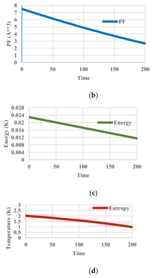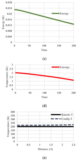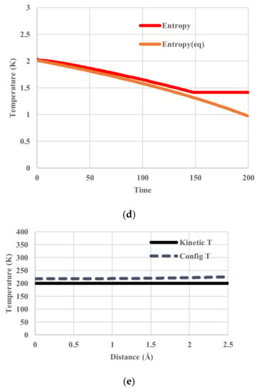 In this case, the temperature of the heat bath decreased from 400 K to 200 K. Since no relaxation effects are included, the temperature of the particles follows that of the heat bath. We name it “kinetic temperature” because the velocity distribution of the particles also adjusts to it instantaneously. This temperature is distinguished from the “configurational temperature”, because the latter reflects the potential energy distribution of the particles. The deviation of the latter from the former originates from relaxation effects. No unit of time is assigned. The profiles of given kinetic temperature, calculated partition function, configurational energy, and configurational entropy are shown in Figure 4. Obviously, all the thermodynamic variables decrease monotonously.