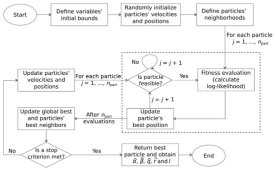 The steps of the PSO algorithm are summarized in Figure 1. The particles’ initialization procedure involves the random generation of particles’ positions within ranges defined in the previous step (“Define variables’ initial bounds”, Figure 1). However, some combinations of values for , , and may result in infeasible particles with respect to the constraints related to the maximum log-likelihood problem considered. In the initialization step, whenever an infeasible position is generated it is immediately discarded, and a new position is then created. This stage ends when all particles’ positions are feasible in the initial swarm.