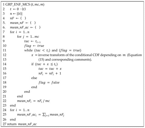 The pseudocode of the algorithm to obtain the GRP expected number of failures via Monte Carlo simulation (GRP_ENF_MCS) is shown in Figure 2. The inputs are the vector of observed failure times (), the number of Monte Carlo replications () and the GRP model (q-Exponential-GRP or q-Weibull-GRP). Lines 2–6 of the pseudocode correspond to the insertion of 0 into vector to include , the definition of as the length of vector (including the 0-th observation), the initialization of the vectors , and that will contain the total number of failures in each of the intervals , the mean number of failures in and the cumulative mean number of failures up to , with , respectively. Then, for each interval , replications are executed to obtain the corresponding mean number of failures (lines 8–22).