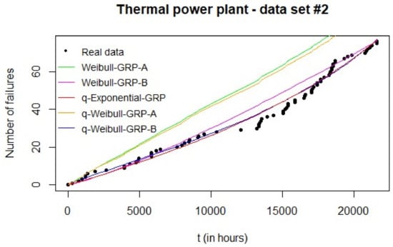 Nevertheless, for the two application examples considered in this work, the observation of the estimates’ values for the parameters and was not sufficient to decide which of the couplings q-Weibull-GRP, q-Exponential-GRP and Weibull-GRP was the most appropriate for a given case. For data set #1, the q-Weibull-GRP provided and , which indicate that the q-Weibull-GRP would be the most suitable model. The three models gave similar log-likelihood values (with a slight advantage for the q-Weibull-GRP), but in terms of MAE evaluated by means of the expected number of failures vs. real data, the q-Exponential-GRP was the best model. For data set #2, the q-Weibull-GRP (B) returned and , which suggest either q-Exponential-GRP or Weibull-GRP as potentially better models. But, for this example, the q-Weibull-GRP (B) was the best one both in terms of log-likelihood and MAE.