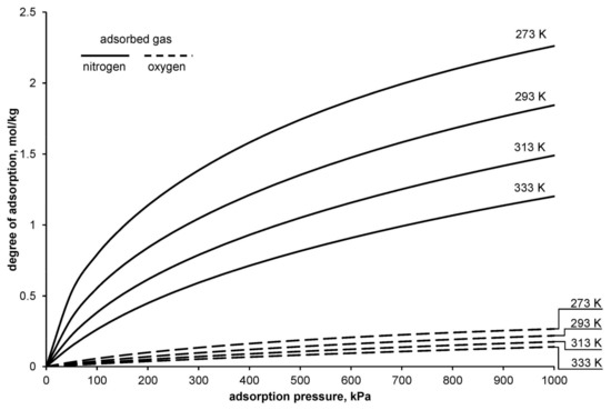 Figure 1 presents a chart of exemplary nitrogen and oxygen adsorption isotherms determined with the use of the DSL model.