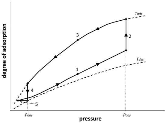 Calculations of the minimum energy consumption of oxygen separation on the 5A zeolite bed were made on the basis of determined isotherms of nitrogen and oxygen adsorption from air—Equations (8) and (9). The calculations were made for adsorption in Vacuum–Pressure–Temperature Swing Adsorption (VPTSA) technology as the most general. Figure 2 shows the adsorption cycle of the VPTSA process carried out in single adsorption bed. The shape of the VPTSA cycle line shown in Figure 2 was obtained in the experimental research process on the apparatus described in Chapter 3.