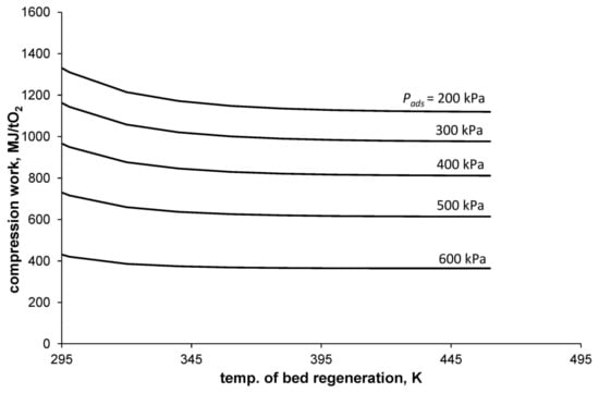 Figure 3 shows the dependence of the compression work per mass unit of separated oxygen with a purity of 95% () on the bed-regeneration temperature and the adsorption pressure. The calculations were made with the assumption that the adsorption temperature is equal to 295 K and the desorption pressure is equal to atmospheric pressure.