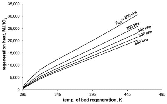 Heat consumption of oxygen separation for different temperatures of bed regeneration and different pressures of adsorption.