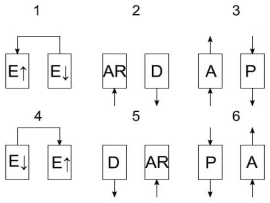 A scheme of the VPSA cycle carried out in the container installation of oxygen separation from air. Symbols used in the Figure 7: E↑/E↓—increasing, decreasing, equalizing pressures; AR—filling with air; A—adsorption; D—desorption; P—rinsing.
