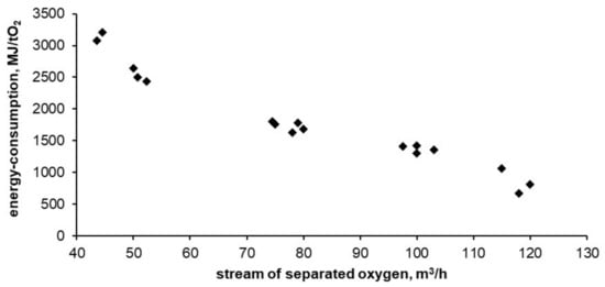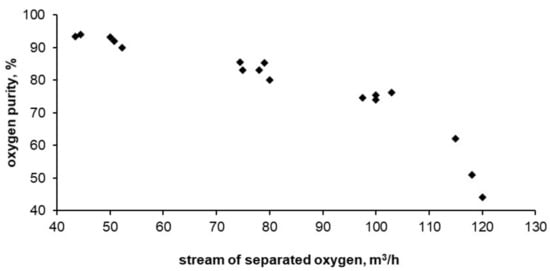 Below, Figure 8, Figure 9 and Figure 10 show the results of tests carried out on the described adsorptive oxygen separator. The data show the relationship between energy consumption, oxygen purity and the stream of separated oxygen. Figure 10 shows the dependence of energy consumption of the apparatus on the purity of the obtained oxygen.