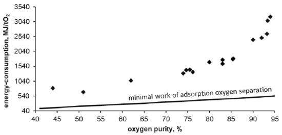 In the tested installation, the energy consumption of oxygen separation was 3200 MJ per ton of oxygen witch a purity of 94%. This is 6 times higher than the thermodynamic minimum that can be obtained for this technology (calculated using the DSL model). The lowest obtained energy consumption reached 670 MJ per ton of oxygen with purity of 50%. This is 3.5 times higher than the thermodynamic minimum that can be obtained for this technology. As expected, with the decrease in purity of the separated oxygen its unit cost is reduced. With reduced oxygen purity, the required energy is asymptotically approaching the thermodynamic minimum possible for adsorption technology.