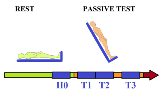 Basic scheme of the head-up tilt (HUT) test. The first part—rest in a supine position, which switches into the so-called passive part after tilting, during which syncope is expected to develop by itself. Then the active part starts (marked by the red arrow) with administration of nitroglycerine, which is supposed to advance the occurrence of syncope. Signals are observed in the four time windows: H0, T1, T2 and T3. Each window represents 300 successive points.