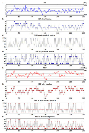 Patient-oriented binning has been found to be significant in assessing cardiac autonomic control and predicting cardiovascular health [13,14] as it introduces an individual, adaptive resolution of events for each subject. Consequently, each signal, mapped into six values, allows the separation of events with different timescales; however, this is, in a way, specific to the individual. It is, nevertheless, evident that such restricted binning does limit the discernment of certain heart rate accelerations or decelerations and certain blood pressure rises and falls. For example, in the case of the signals shown in Figure 3, changes in RR-intervals smaller than 52 ms and changes in SBP smaller than 3.6 mmHg may become flattened. In the remaining data, the mean bin in the case of RR-intervals spreads from ms in T2 to ms in H0. For SBP, the mean bin takes values from mmHg in H0 to mmHg in T3. In the case of RR-intervals, one can consider such large binning as appropriate for distinguishing changes caused by vagal activity from changes due to other factors. Accordingly, one can relate the larger binning in H0 to stronger vagal activity presumed to occur in that part of the HUT test in keeping with commonly accepted knowledge of physiology [4,5,6]. The bin size of SBP values may, therefore, be supposed to reveal effective actions of the known mechanisms regulating blood pressure: the sympathetic activity and the mechanisms related to endothelium [22]. Consequently, as the increase in the bin size is observed with the passing time during the HUT test, one can hypothesize that the mechanisms regulating the blood pressure are gradually activated, leading to an acceleration of changes in blood pressure. Our observations are supported by the physiology of blood pressure regulation, where it is known that prolonged sympathetic activity provokes the emergence of mechanisms related to endothelium [22].