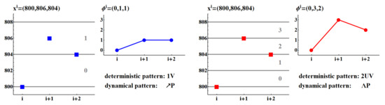 In order to provide more detailed insight into this method, let us consider a segment with values (800, 806, 804); see Figure 5. In the case of , Equation (2) leads to , but in the case of , Equation (2) shows . Accordingly, the following patterns are assigned when changes: deterministic: 1V → 2UV, and dynamical: →. Hence, the small values of lead to more frequent detection of variations in a signal, while for large many of these variations disappear.