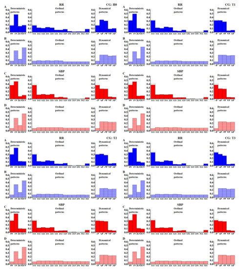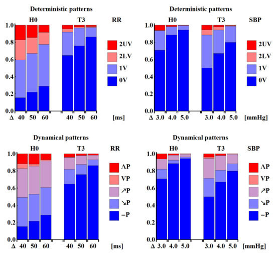 Figure 6 shows the probability distributions of patterns obtained by pooling the results according to the specific pattern representation: deterministic, dynamical or ordinal, and to the type of signal: original or shuffled values. One can observe that what clearly distinguishes the original signals from the shuffled ones is the role of the flat pattern, i.e., pattern ‘(111)’ ≡ ‘0V’ ≡ ‘−P’. In all the time windows, there is more evidence of flat patterns in the unperturbed signals than in the shuffled signals. The transition to the upright body position results in a gradual increase of the probability of observing a flat pattern in the subsequent time windows in the case of the RR-intervals. The low participation of the flat patterns in the RR-signals in the H0 time window remains in agreement with the above-mentioned interpretation, i.e., it results from the domination of the vagal activity in the relaxed supine position. Based on the known physiology of orthostatic stress [4,6,22], the abundance of flat patterns in the T1–T3 time windows should rather be related to slow variability, which emerges after the tilt due the withdrawal of vagal activity and the simultaneous activation of the sympathetic system. The opposite effect, i.e., a gradual decrease in the probability of encountering a flat pattern in subsequent time windows of SBP values, is observed. Instead, one observes a considerable presence of ordinal patterns (112) (122) (211) (221), which may be associated with slow changes. This results in the increased presence of the ‘1V’ deterministic pattern, and ‘↗P’ and ‘↘P’ dynamical patterns. Effectively, signals represented by the deterministic patterns could be seen as two-valued signals, and signals represented by the dynamical patterns as three-valued signals.