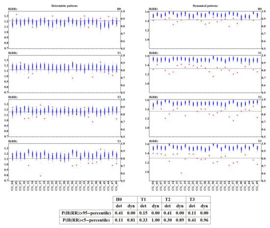 By grouping subjects according to the time windows of the HUT test, the individual variability of a subject could be lost. To test how signals for a given subject change under the condition of the HUT test, and how the signals vary between individuals, we study alterations in ShE in subsequent time windows of the HUT test for each subject separately. In Figure 9, the entropy of each individual patient is shown, but in a patient-specific follow-up using the adaptive binning procedure. The patients’ signals are divided into two groups—those that are in agreement with the findings of Wejer et al. [11] and others. This approach significantly improves the statistical power of the test for the group discrimination; see notes under Figure 9. In particular, we see that, in both symbolizations for RR-intervals, the entropy in the T2 window appears to be statistically indistinguishable from the entropy obtained in H0. In the remaining time windows: T1 and T3, the entropy is distinct from the entropy in H0. ShE is mostly lower in T1: 22 cases of 27 considered in the deterministic and 23 cases in the dynamical symbolization. In T3, ShE is also mostly lower: 23 cases in the deterministic and 24 cases in the dynamical symbolization. The one-sided Mann–Whitney test for lower entropy in T3 than in H0 in both pattern representations gives high significance (p < 0.0001) to the hypothesis that .