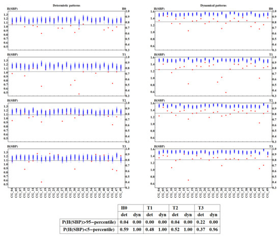 However, the hypothesis of greater value of entropy estimated from SBP values in the T3 window when compared to the H0 window is not obvious. For signals represented by the deterministic patterns, we count 18 such cases, which in the one-sided Mann–Whitney test leads to satisfactory statistical significance (). For the dynamical pattern representation, the presence of only 11 such cases does not support the hypothesis of the entropy increase in the late tilt time window.